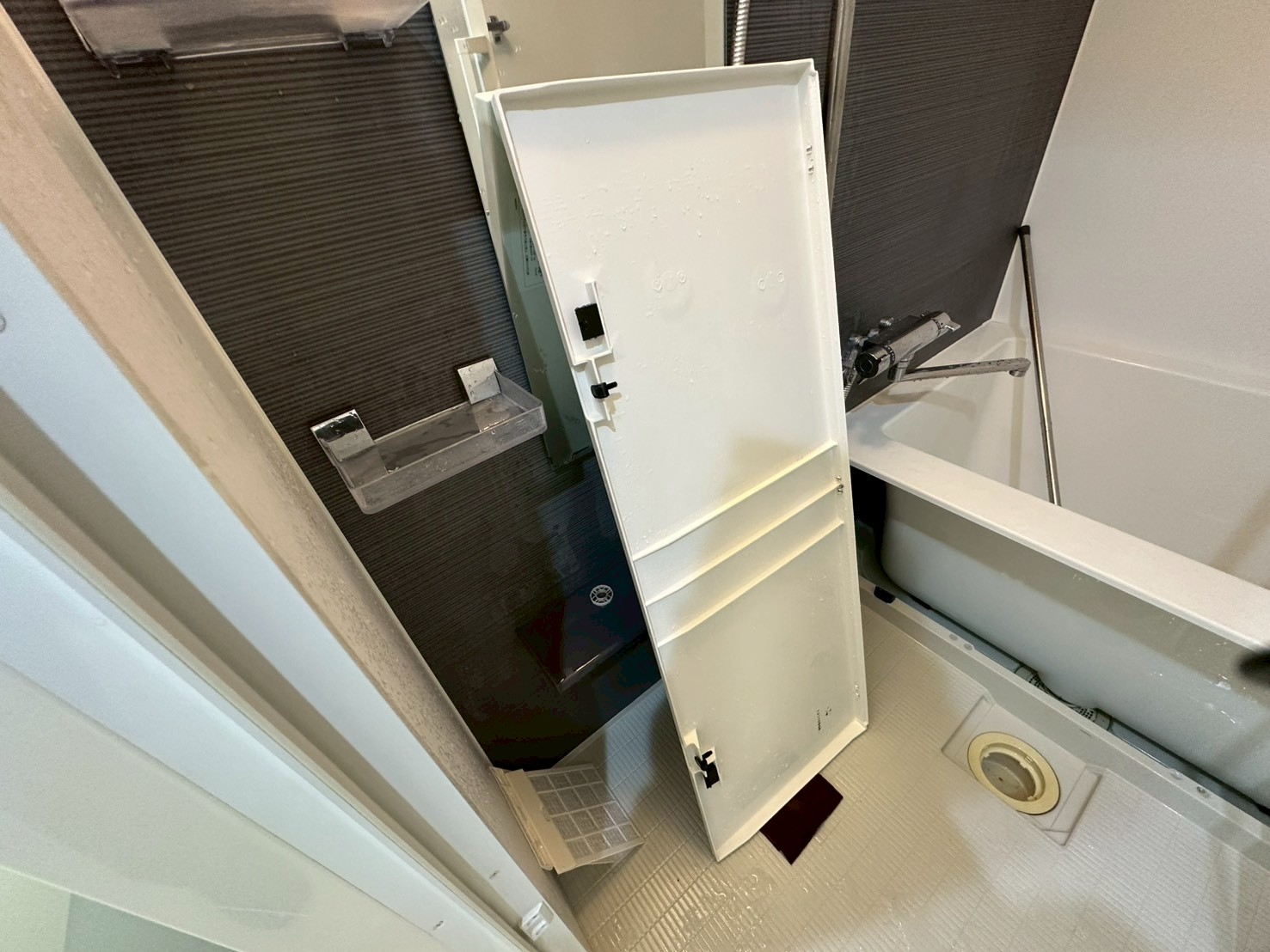 浴室では、普段は目に見えないエプロン内部を高圧洗浄し、皮脂汚れやカビを徹底的に除去しました。
